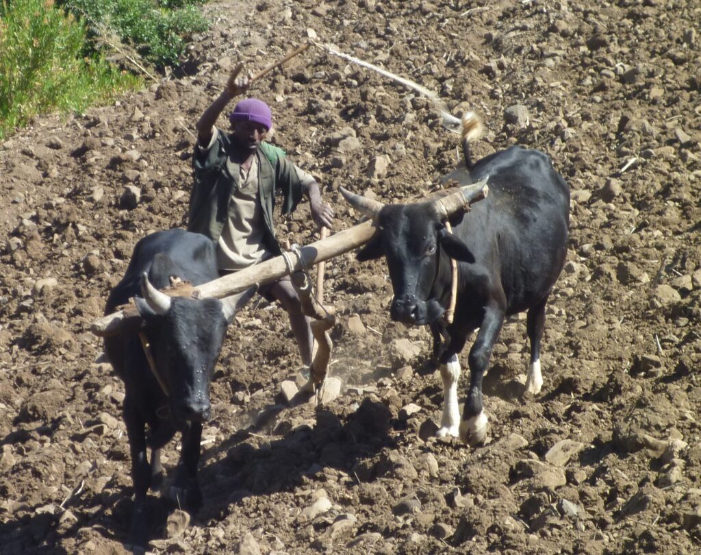The scenes on the drive to Lalibela are snapshots from a different era to airports, world weary travellers and smartly dressed tourists. Teams of oxen thresh the teff (a grain like wheat), trudging round and round, raising the dust. Donkeys and goats share the road reluctantly with the convoy heading to town; men till the unyielding soil with wooden ploughs pulled grimly by oxen. The primitive rural landscape is similar in ‘upcountry’ and ‘down country’ Ethiopia, but the pilgrim bands appear around Lalibela only a few times a year, including their New Year on 11 September and their Christmas, Gena, celebrated on 7 January.